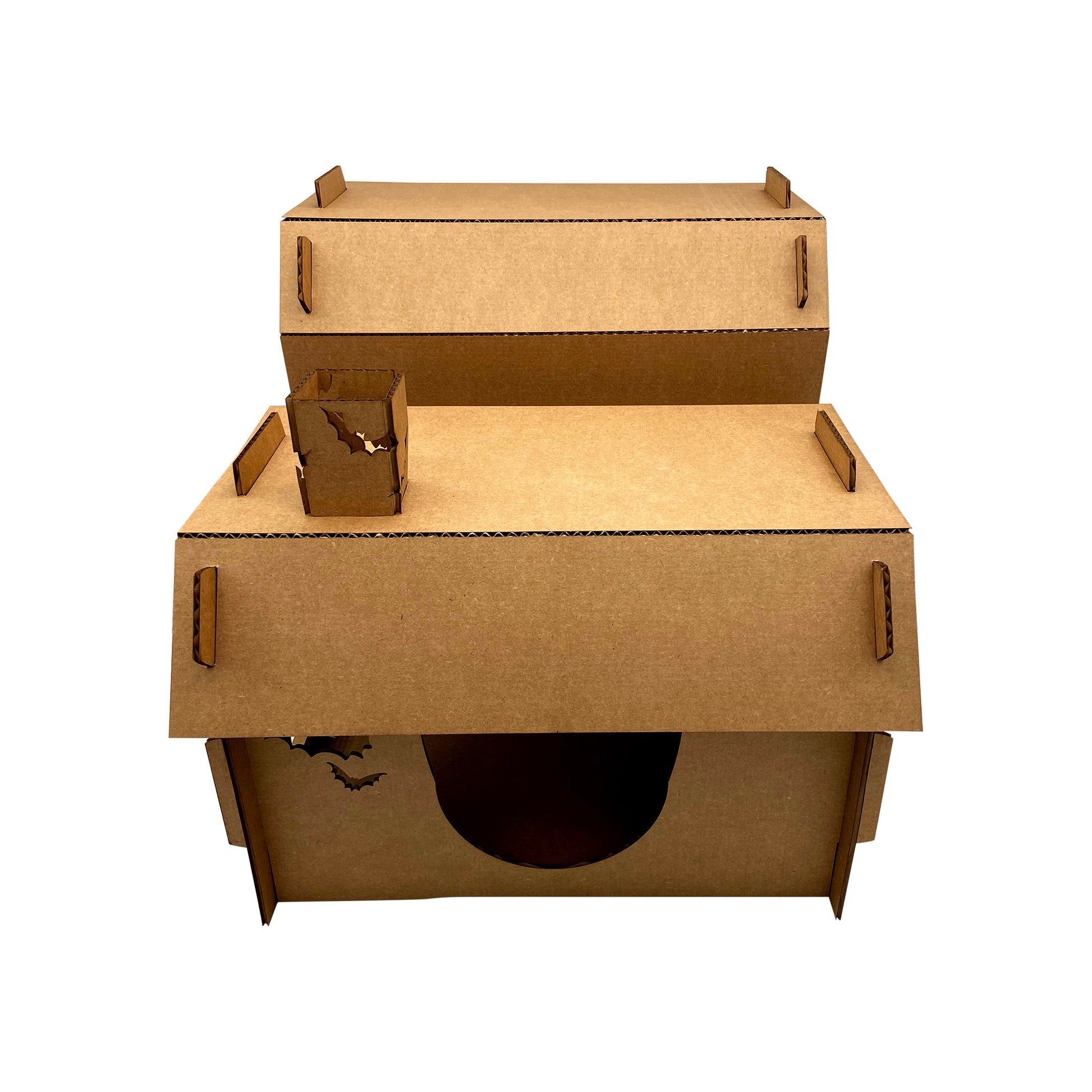 Are we detecting some purr-anormal activity… or is it just our Kitty Haunted House? 🎃 Get your home and your kitties ready for Halloween with our newest, spookiest cardboard cat house design. Like all of our offerings, our cat-themed Haunted House is made of 200 lb. test corrugated cardboard so it remains sturdy throughout all of the Halloween season. Plus, we added intricate bat-shaped details to up the creepy factor, perfect for incorporating with the rest of your Halloween decor. This design has three doors, one in the front, one on the side, and one on the back, so your kitty has tons of ways to check out or flee this Haunted House.